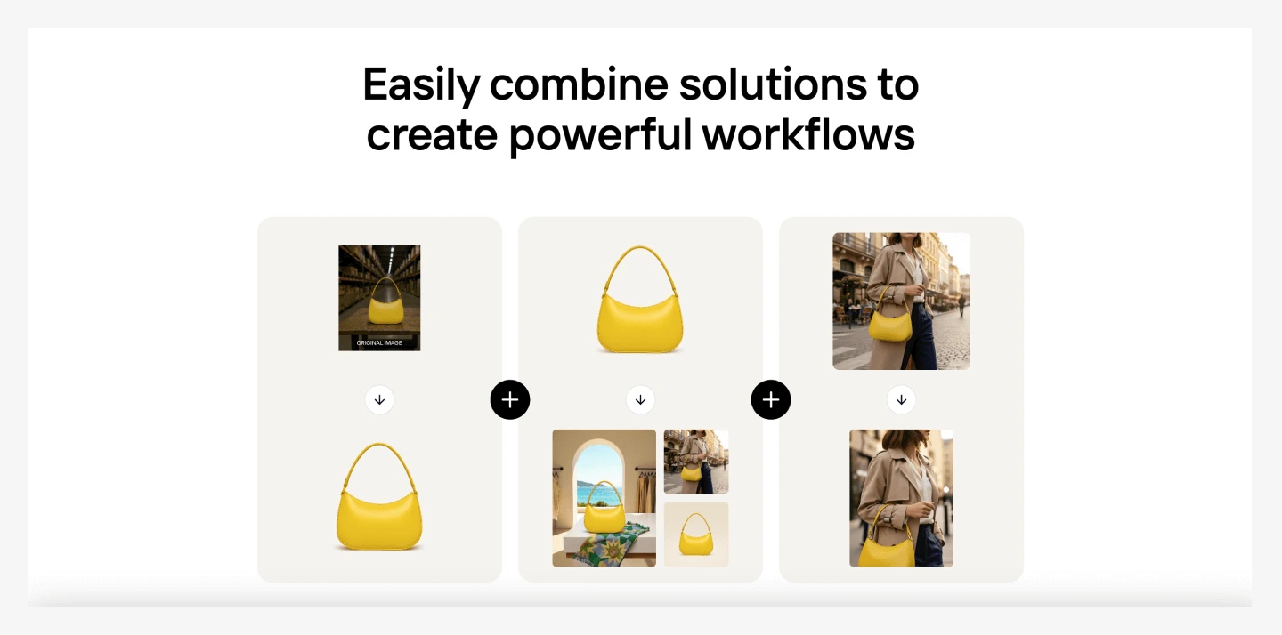 Combine various API solutions (Remove Background API, Image Editing API, and Generate Background API, among others) to create powerful custom and automatic workflows with a single endpoint.