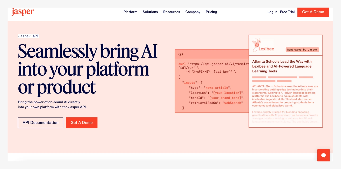 Ideal use case: You run the Shopify store for a small-batch perfume company. Add Jasper’s image editing API to your content management system to automatically clean up product photos (remove backgrounds, adjust lighting, reconfigure composition), align them with brand standards, and prepare them for upload.