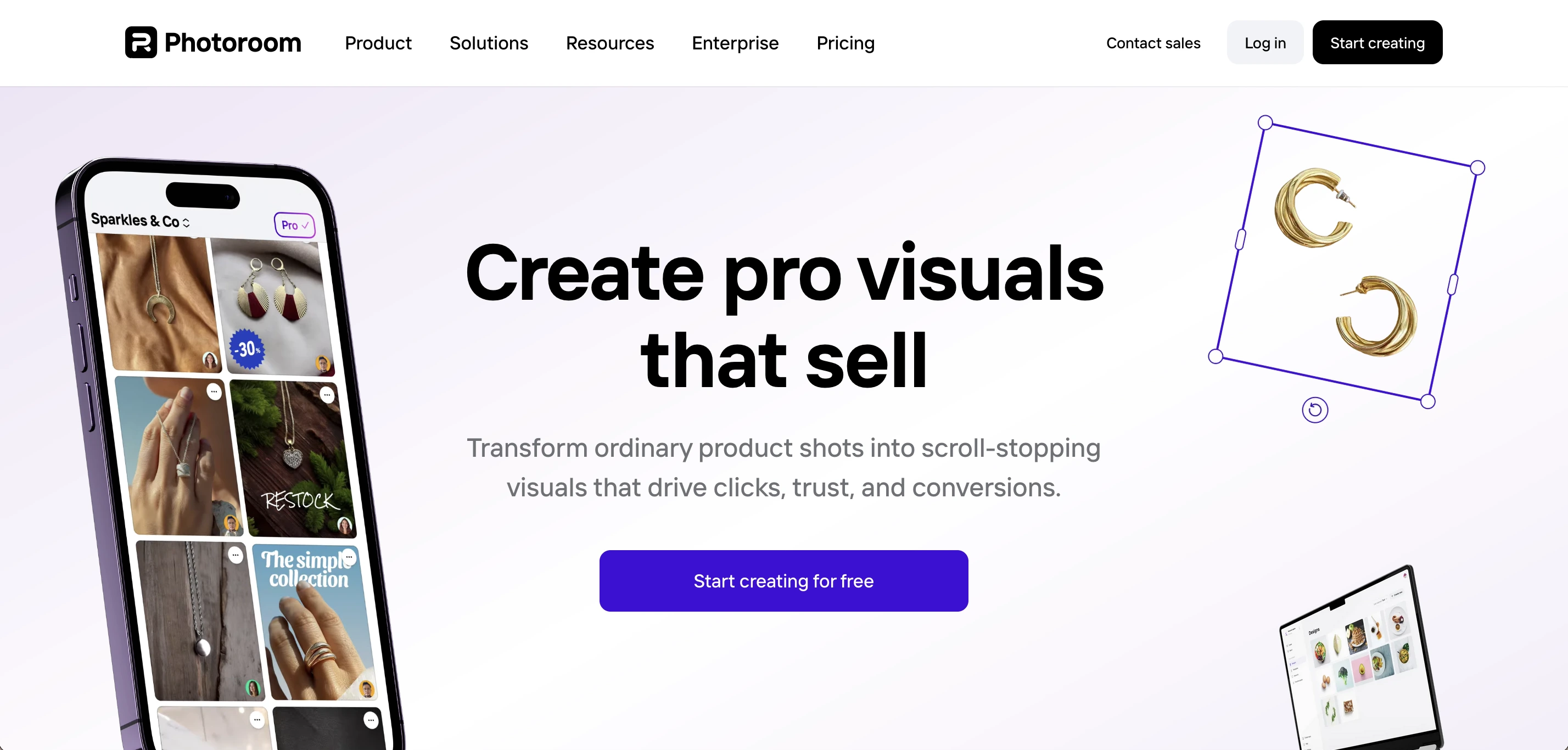 | Photoroom | Integrated into photo editing workflows | Beautiful product visuals | Text and image-to-image prompting, batch background image creation, team collaboration | Free; paid starts at $4.99/week |