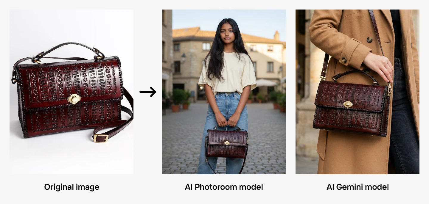 Photoroom is trained specifically on e-commerce images, ensuring accurate and realistic product presentation without hallucination. Gemini is not trained for e-commerce and marketplace use cases specifically, so it often hallucinates and produces variable outputs, altering the product in the image.