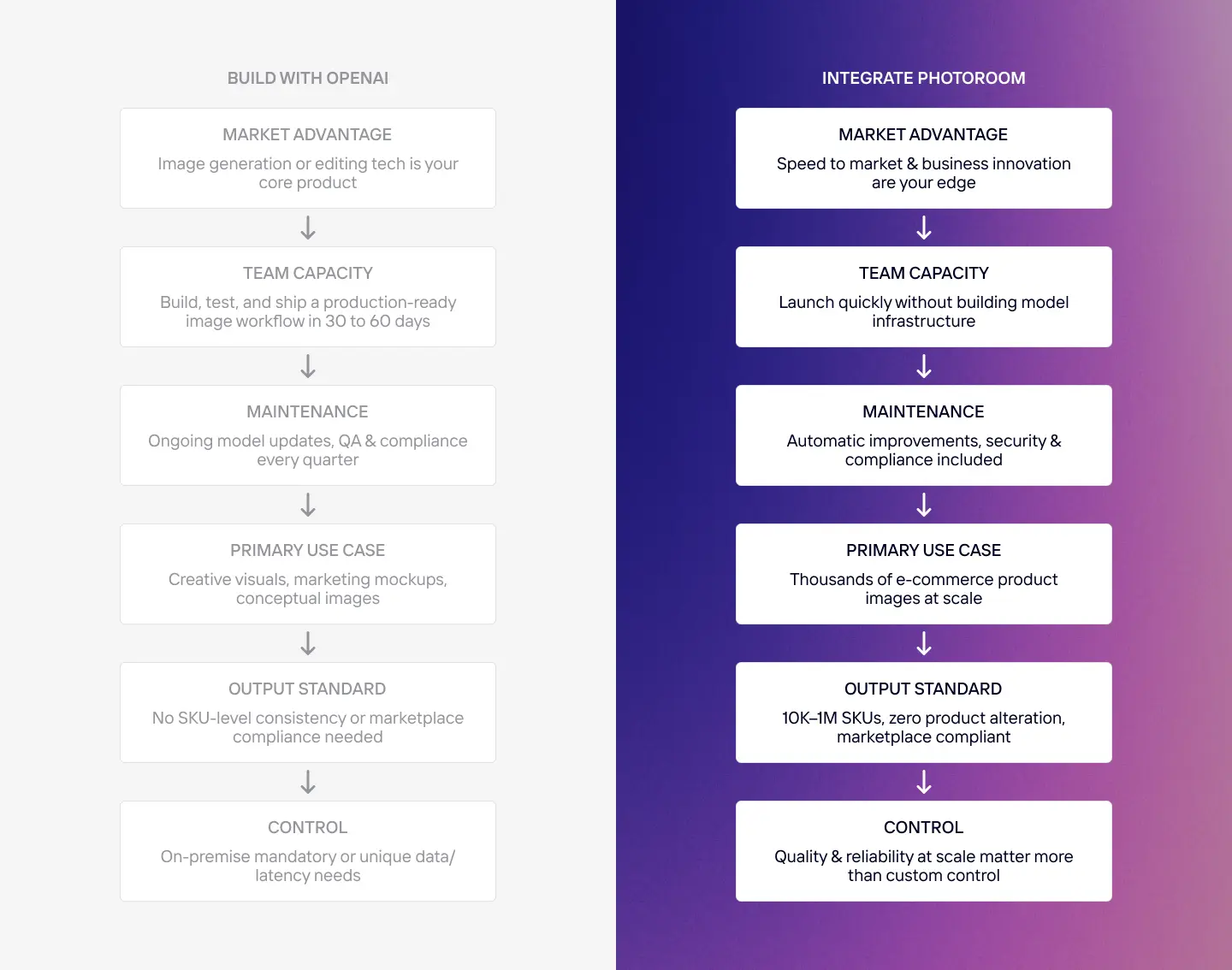 Use the build vs buy decision framework below to determine whether to build with OpenAI or integrate Photoroom's API into your product photo workflow.