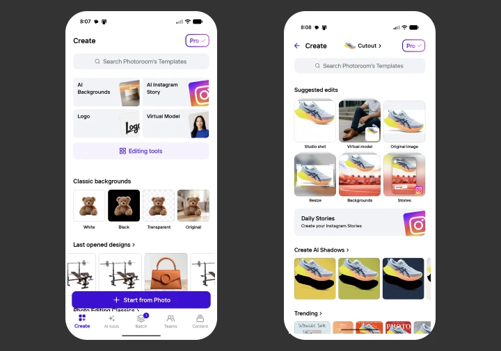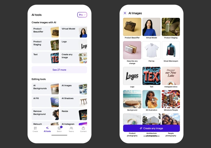 Photoroom’s AI capabilities are designed to create consistent, high-quality product visuals, while VistaCreate’s AI works for light editing but isn’t core to the platform.