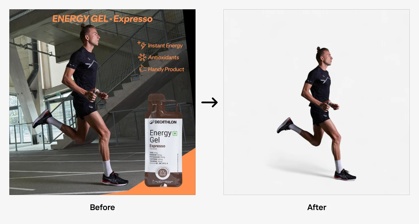 With external agencies editing images manually, Decathlon faced inconsistent product visuals and long turnaround times. Teams at Decathlon would download pictures from their digital asset management (DAM) system, send them to the agencies, wait for editors to manually edit in Photoshop, review results, send feedback for revisions, and wait again for corrections.