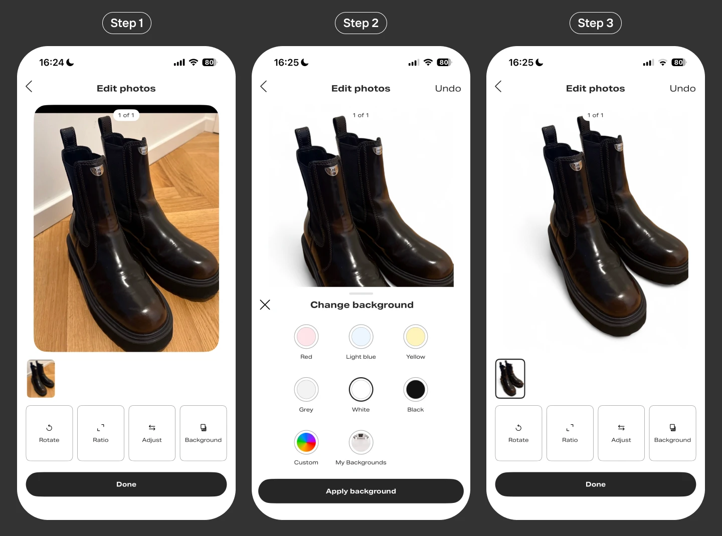The result is a set of Photoroom API powered features embedded directly into Depop's listing flow: background removal, AI shadows, and image resizing. Sellers access them for free, right where they're already creating listings, without needing external apps or subscriptions.