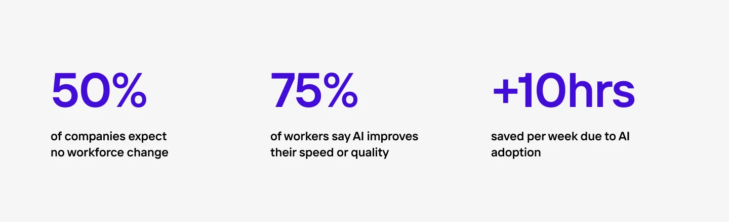 While talk of AI replacing jobs dominates headlines, both the data and our interviews point in the opposite direction. McKinsey finds that nearly 50% of companies expect no change in workforce size from AI adoption, and OpenAI reports that 75% of workers say AI improves their speed or quality, saving heavy users more than 10 hours per week.