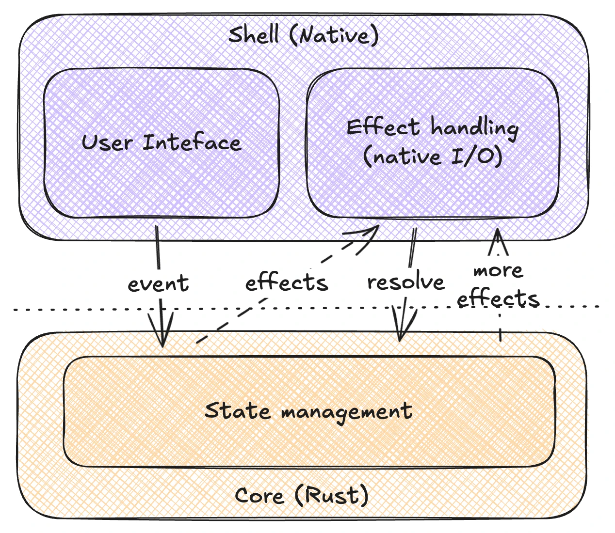 fn handle_response<T>(effect: EffectRequest, response: T) -> Vec<EffectRequest>The first receives an event from the app (in response to a user action) and returns zero or more “effect requests” - requests for some I/O to be performed. If the I/O request needs a response (most do, like HTTP or disk I/O for example), this is sent back to the core using the second function. Even the second function returns effect requests, enabling longer effect chains to happen.