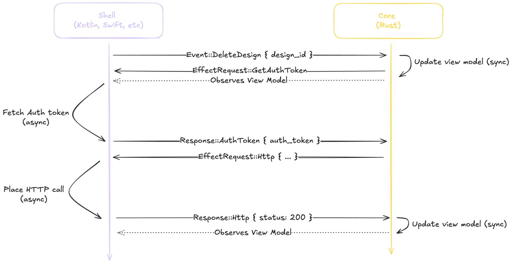process_event(Event::DeleteDesign { design_id })During this call, the core will synchronously update its view model to let the user know the action has been taken into account. It can be either optimistically removing the design from the list, or marking it as 'currently loading' depending on the experience we want to provide.