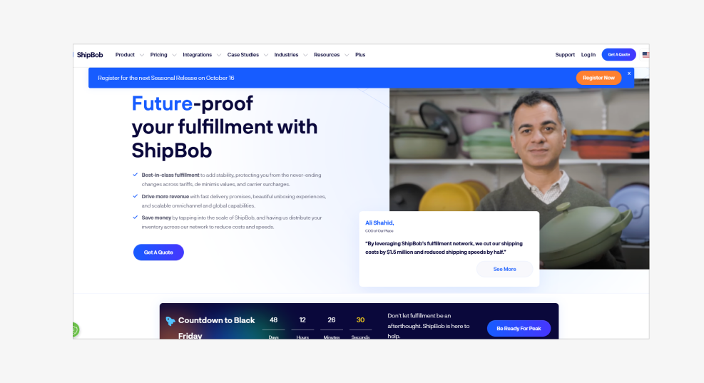 ShipBob ensures orders ship fast even under high demand through distributed warehousing and automated fulfillment.