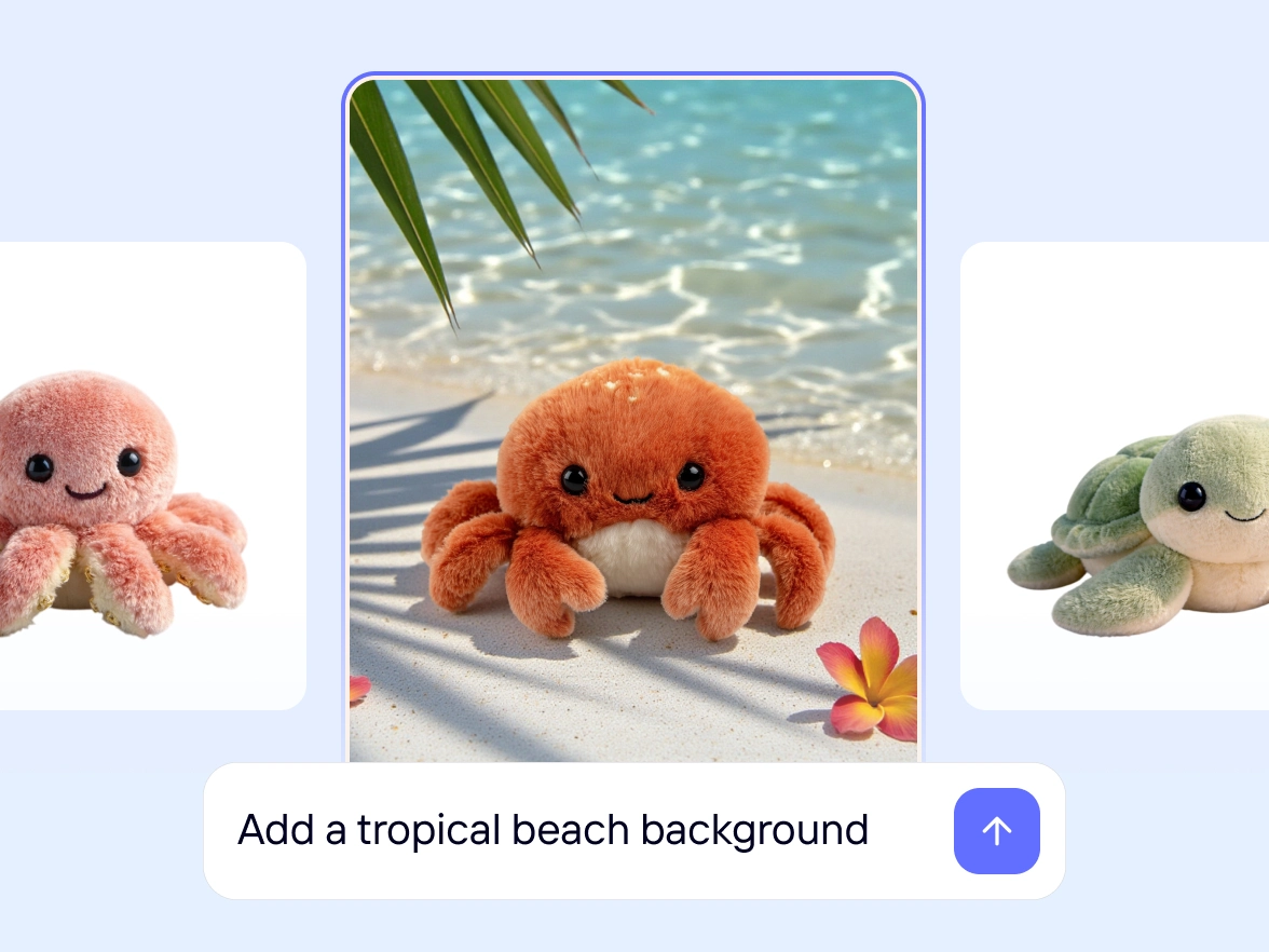 Instead of editing your product photos by hand, simply explain what you want to change. The AI updates your product image instantly: objects removed, colors adjusted, or backgrounds transformed. You stay in control of the result without using complex editing software.